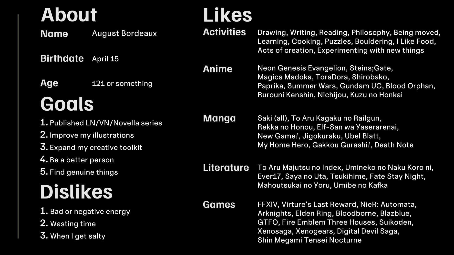 Oh, hello! Welcome to my workshop!August is a century old puppet that studies magic and the sciences to reach the fabled Tree of Knowledge. A hobby of his is to observe and learn about humanity and their many cultures, especially taken an interest of that of otaku and other nerd cultures.